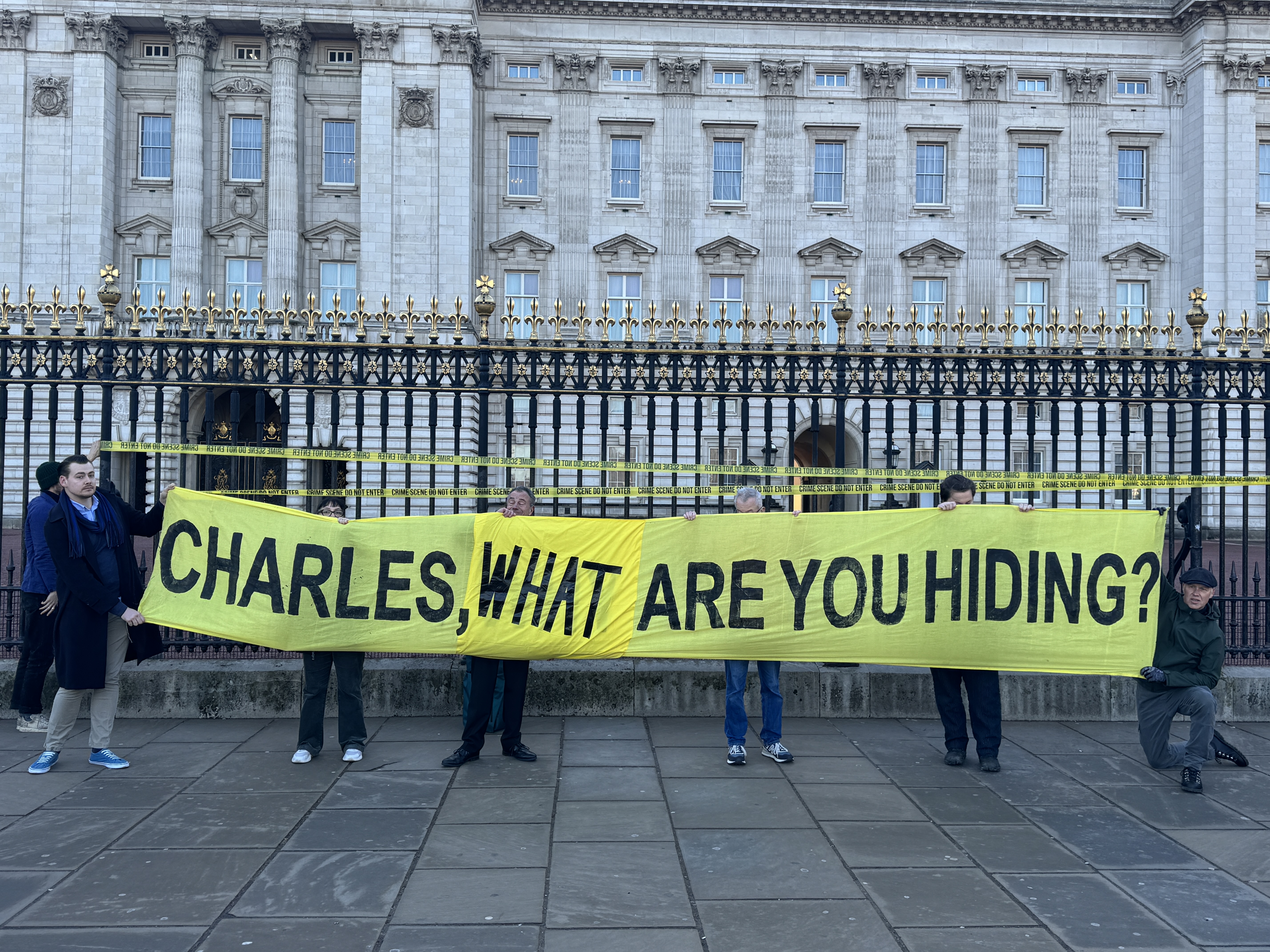 Activists from Republic held up a banner saying "Charles, what are you hiding?" while yellow and black "Crime Scene. Do Not Enter" tape was run along the fence.