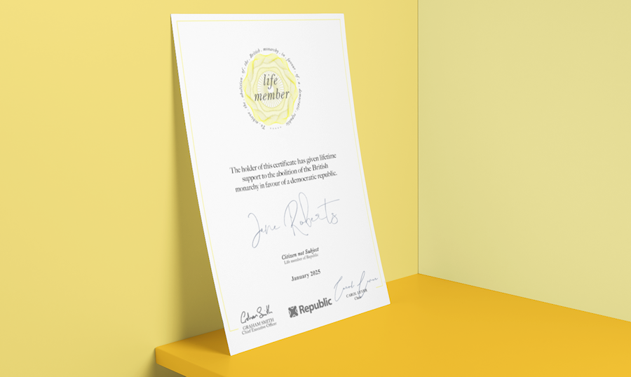 You'll receive a personnally signed letter of thanks from Republic's CEO, Graham Smith, and a personalised Life Member certificate. Republic is also working on developing new updates and emails for Life Members, keeping you up to date on the campaign and the issues we campaign on.