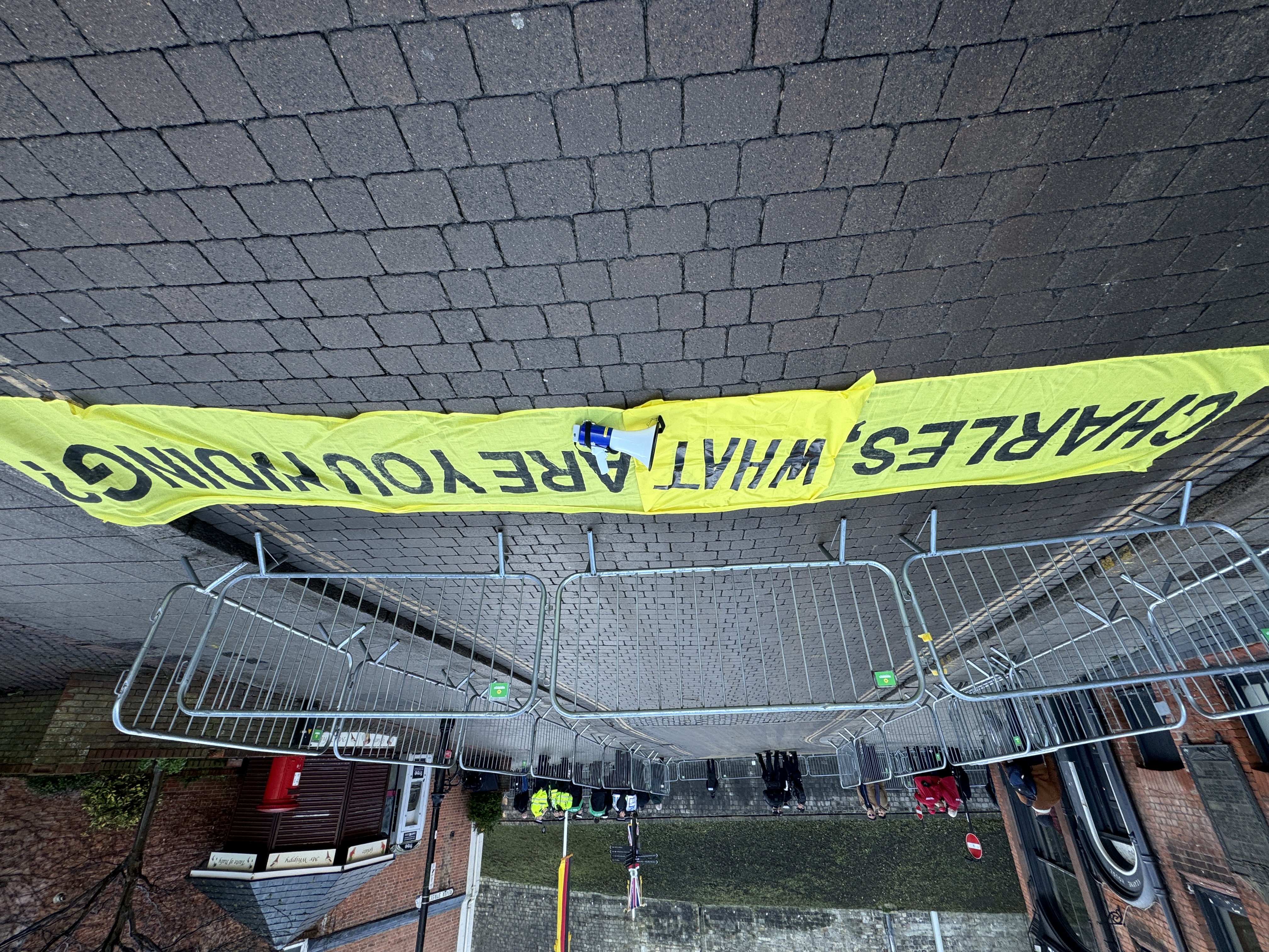 On Wednesday 3rd December, a small Republic volunteer team planned to display a banner during the German President’s State Visit in Windsor as the Royals passed in golden carriages. When we tried to position ourselves near the media viewing area, police intervened, moving us to a pen far from the route and threatening arrest for using a megaphone, showing the banner, or even heckling Charles anywhere else in Windsor.